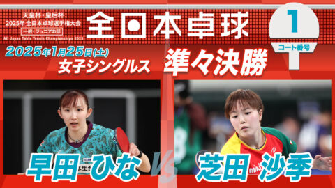 【見逃し配信】2025年全日本卓球選手権大会【5日目:1/25】:女子シングルス準々決勝 早田ひな vs 芝田沙季(コートNo.01)