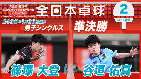 【見逃し配信】2025年全日本卓球選手権大会【6日目:1/26】:男子シングルス準決勝 篠塚大登 vs 谷垣佑真(コートNo.02)