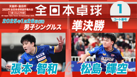 【見逃し配信】2025年全日本卓球選手権大会【6日目:1/26】:男子シングルス準決勝 張本智和 vs 松島輝空(コートNo.01)