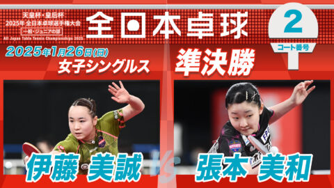 【見逃し配信】2025年全日本卓球選手権大会【6日目:1/26】:女子シングルス準決勝 伊藤美誠 vs 張本美和(コートNo.02)