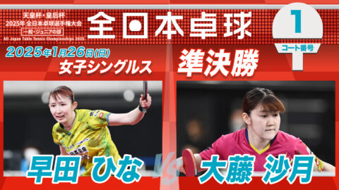 【見逃し配信】2025年全日本卓球選手権大会【6日目:1/26】:女子シングルス準決勝 早田ひな vs 大藤沙月(コートNo.01)