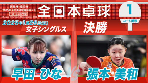 【見逃し配信】2025年全日本卓球選手権大会【6日目:1/26】:女子シングルス決勝 早田ひな vs 張本美和(コートNo.01)