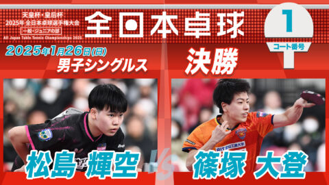 【見逃し配信】2025年全日本卓球選手権大会【6日目:1/26】:男子シングルス決勝 松島輝空 vs 篠塚大登(コートNo.01)