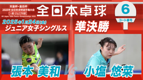 【見逃し配信】2025年全日本卓球選手権大会【4日目:1/24】:ジュニア女子準決勝 張本美和 vs 小塩悠菜(コートNo.06)