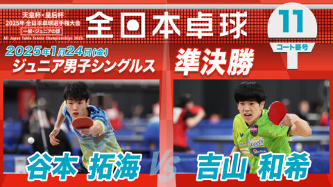 【見逃し配信】2025年全日本卓球選手権大会【4日目:1/24】:ジュニア男子準決勝 谷本拓海 vs 吉山和希(コートNo.11)