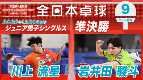 【見逃し配信】2025年全日本卓球選手権大会【4日目:1/24】:ジュニア男子準決勝 川上流星 vs 岩井田駿斗(コートNo.09)