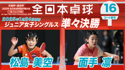 【見逃し配信】2025年全日本卓球選手権大会【4日目:1/24】:ジュニア女子準々決勝 松島美空 vs 面手凛(コートNo.16)