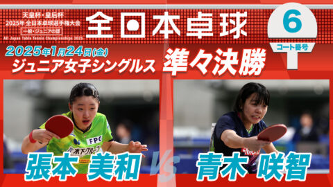 【見逃し配信】2025年全日本卓球選手権大会【4日目:1/24】:ジュニア女子準々決勝 張本美和 vs 青木咲智(コートNo.06)
