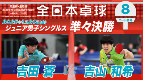【見逃し配信】2025年全日本卓球選手権大会【4日目:1/24】:ジュニア男子準々決勝 吉田蒼 vs 吉山和希(コートNo.08)