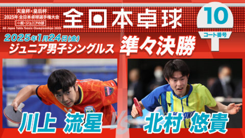 【見逃し配信】2025年全日本卓球選手権大会【4日目:1/24】:ジュニア男子準々決勝 川上流星 vs 北村悠貴(コートNo.10)