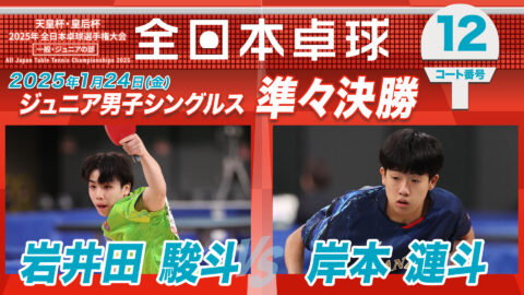 【見逃し配信】2025年全日本卓球選手権大会【4日目:1/24】:ジュニア男子準々決勝 岩井田駿斗 vs 岸本漣斗(コートNo.12)